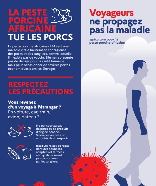 - Le virus pouvant se transmettre aux sangliers et aux porcs par l’ingestion de restes alimentaires, il est important de ne pas jeter les restes de repas dans la nature. Les restes alimentaires doivent être placés dans des poubelles fermées.