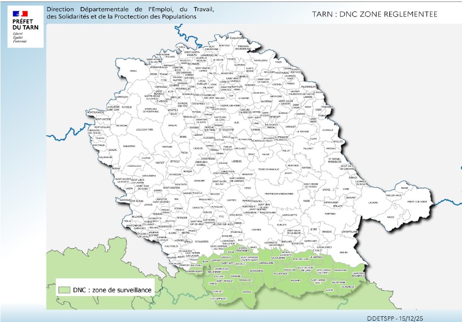 vous trouverez ci dessous le mail de communication de la DDETSPP à destination des éleveurs du TARN faisant partie de la nouvelle Zone Règlementée DNC suite au foyer découvert dans l'Aude le 14/12/2025.