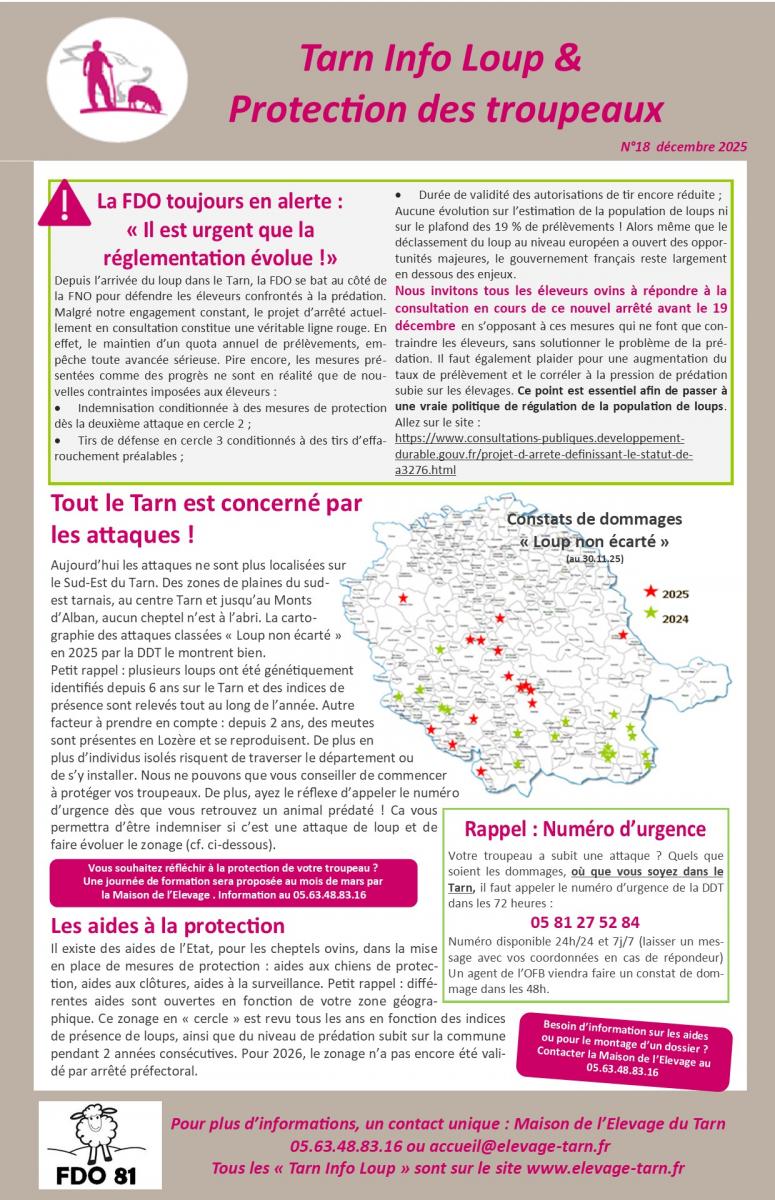 Toutes les actualités et les informations dans la New-Letters "Tarn Info Loup" : la Maison de l'Elevage, en collaboration avec la FDO81, vous informe !
