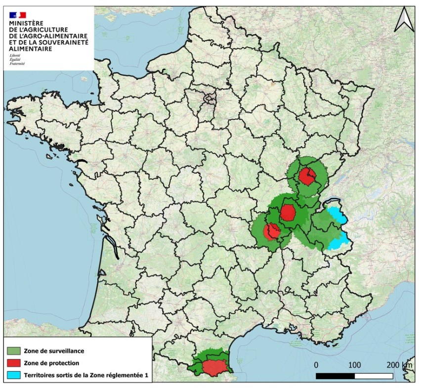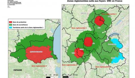 Trois foyers de dermatose nodulaire contagieuse bovine (DNC) ont été confirmés dans les Pyrénées- Orientales, le 15 octobre. Ils se situent dans les communes de La Bastide, Oms et Valmanya. Dans une zone de 50 km de rayon autour des foyers, une campagne de vaccination obligatoire sera mise en œuvre et prise en charge par l’État. Cette zone réglementée couvre la totalité du département des Pyrénées-Orientales, ainsi qu’une partie de l’Ariège et de l’Aude. Elle recouvre et remplace la zone réglementée mise en place au début du mois d’octobre sur une partie des Pyrénées-Orientales, suite à la détection de 9 foyers dans le nord de l’Espagne.